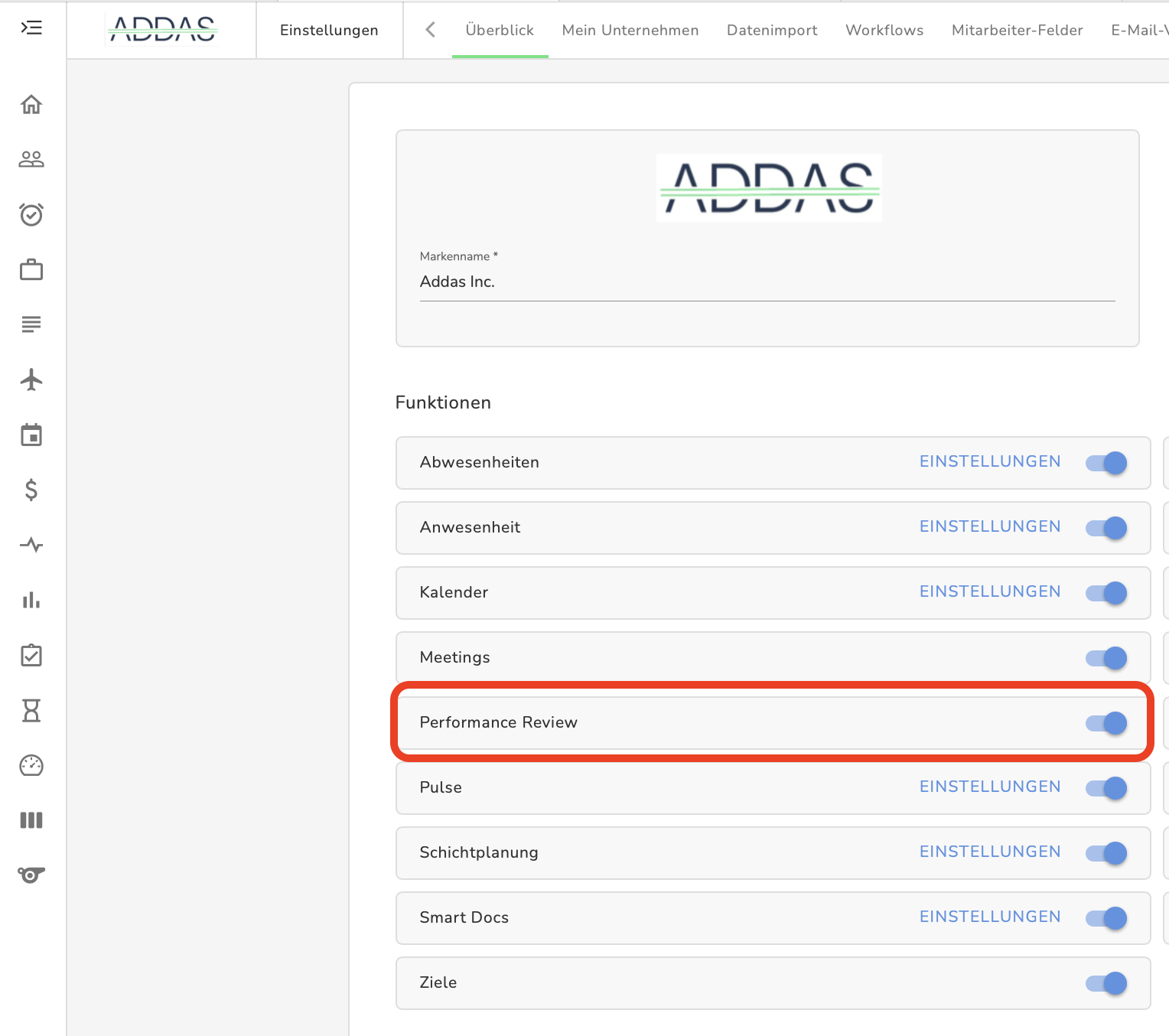 Um Performance Reviews zu aktivieren, gehe zu Einstellungen > Übersicht > Funktionen und schiebe den Regler nach rechts.