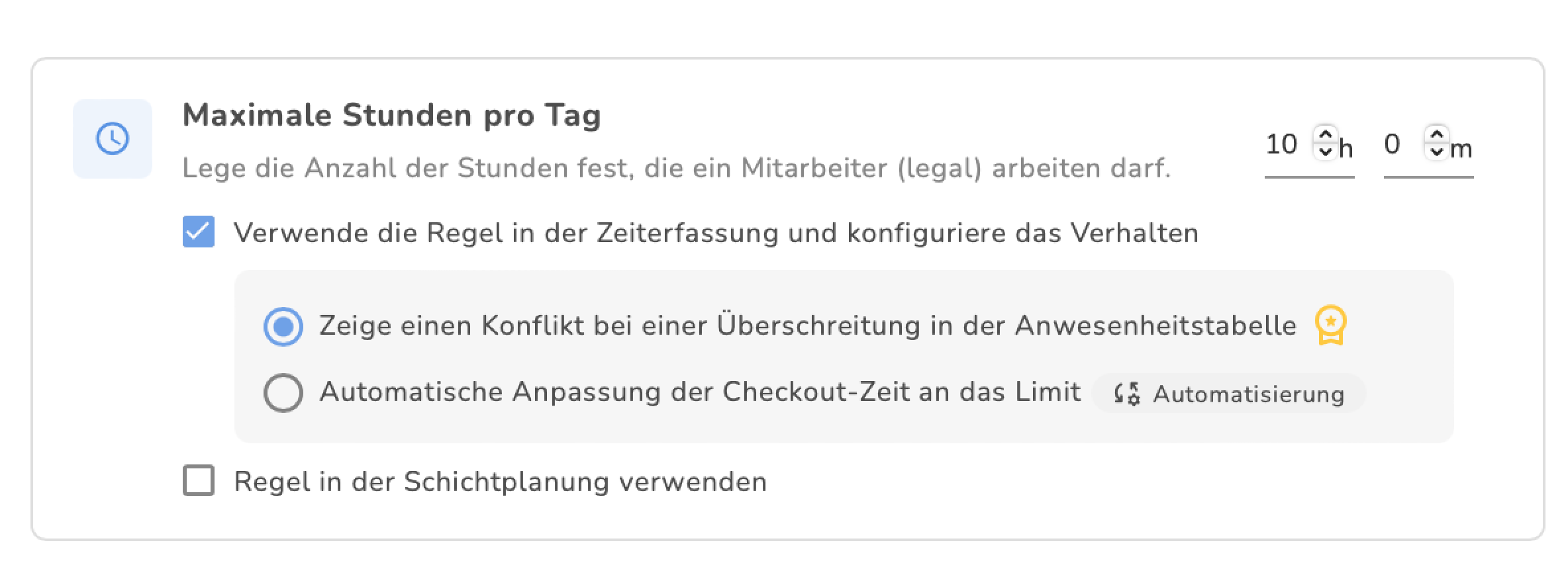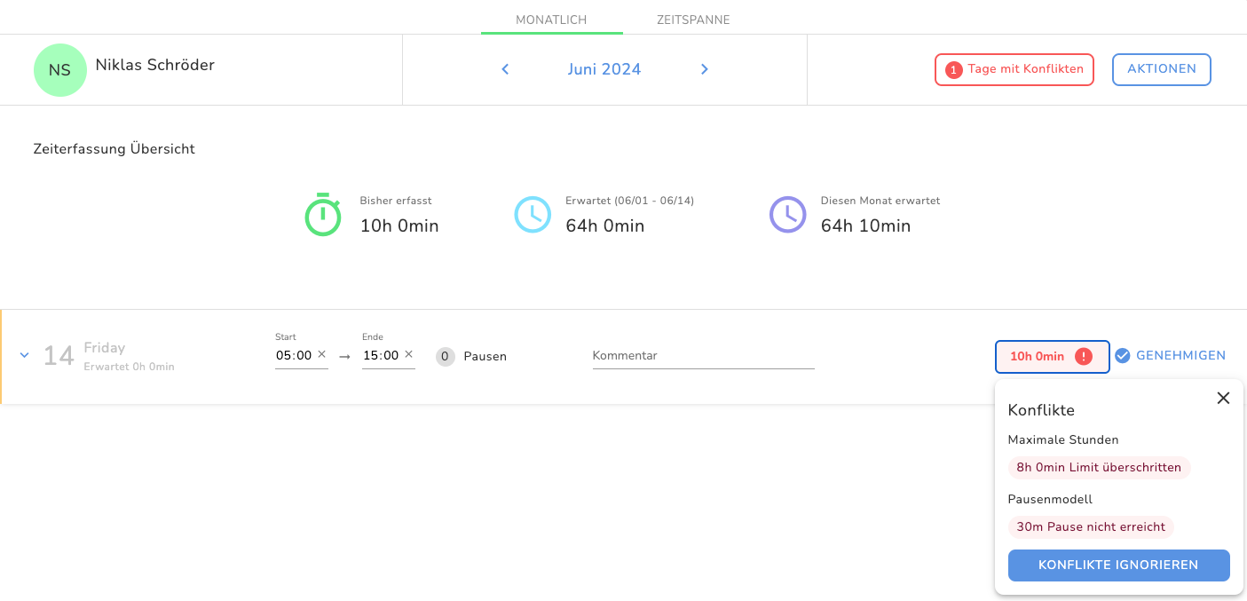 Hinweis: Wir hindern Mitarbeiter nicht daran, Zeiteinträge mit Konflikten vorzunehmen – der Eintrag wird lediglich als Konflikt markiert.