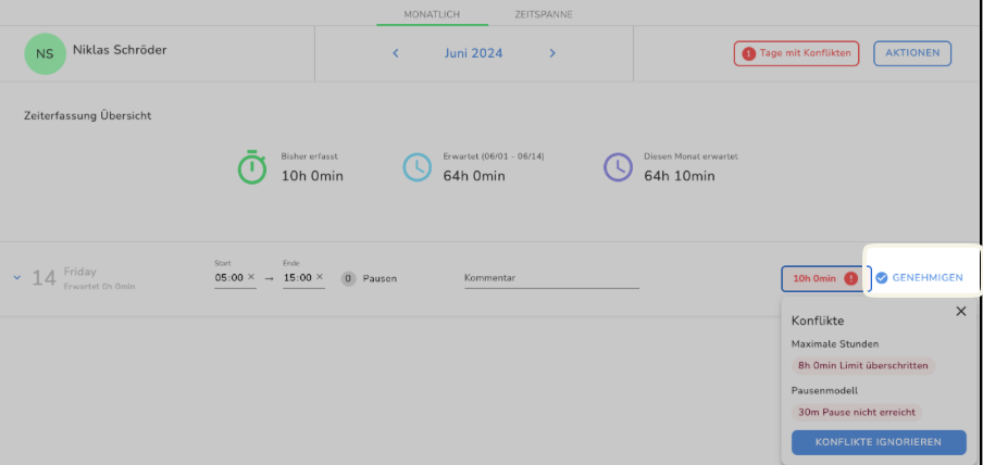 - Klicke auf GENEHMIGEN direkt beim Zeiteintrag
