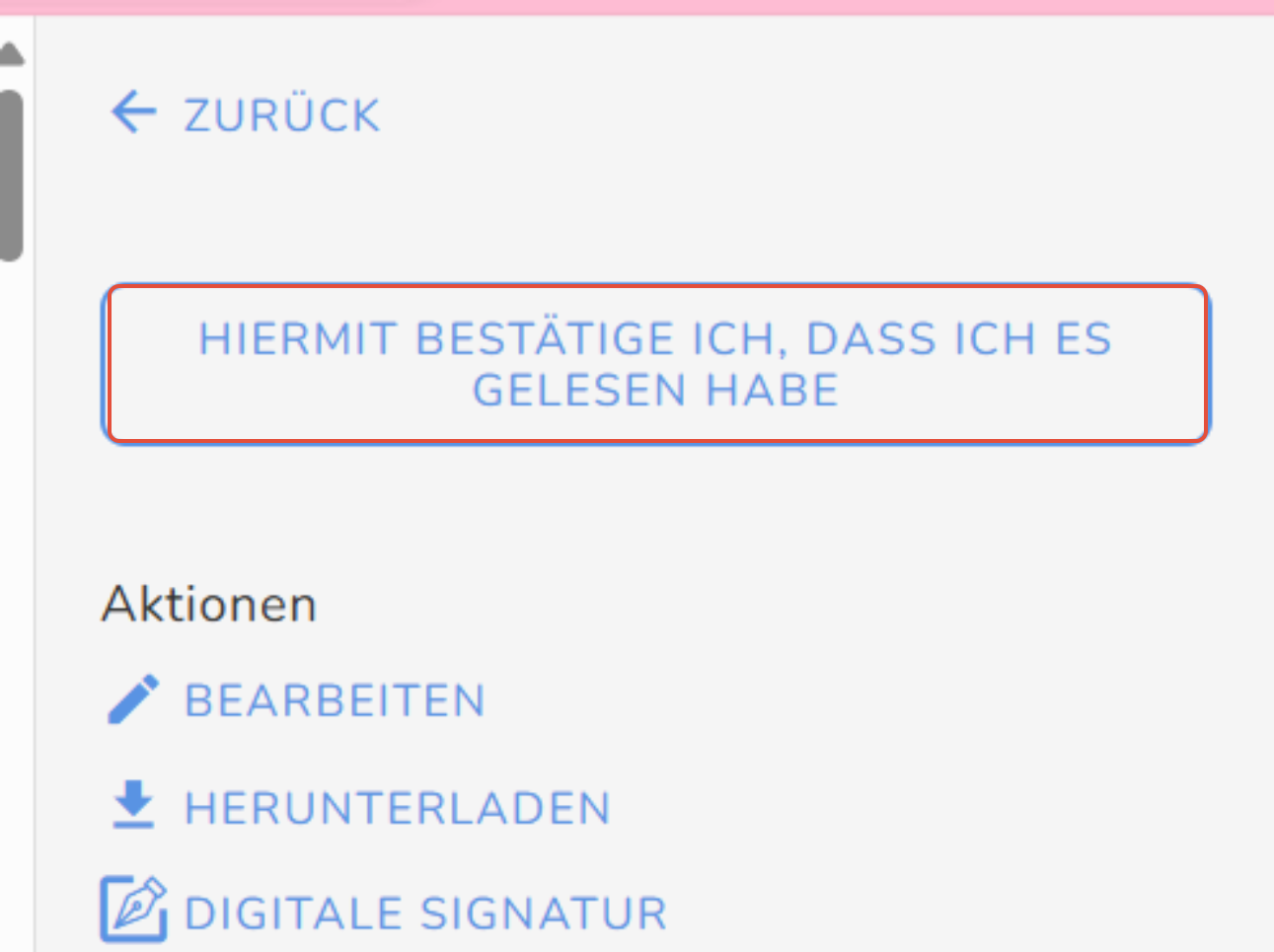 - Der Mitarbeiter erhält per E-Mail die Lesebestätigungsanfrage und klickt im Dokument auf Ich bestätige, dass ich das Dokument gelesen habe.