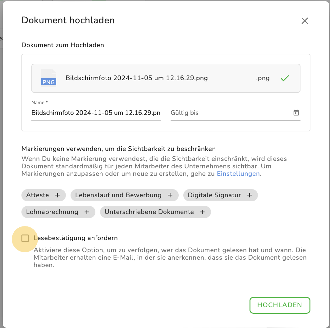 Beachte, dass du Markierungen verwenden kannst, um die Sichtbarkeit von Dokumenten für deine Mitarbeiter einzuschränken. Hierzu wähle die Markierung für z.B. eine Abteilungen deines Unternehmens aus. Wenn du jedoch keine Einschränkungen für die Sichtbarkeit des Dokuments festlegst, ist das Dokument für alle verfügbar.
