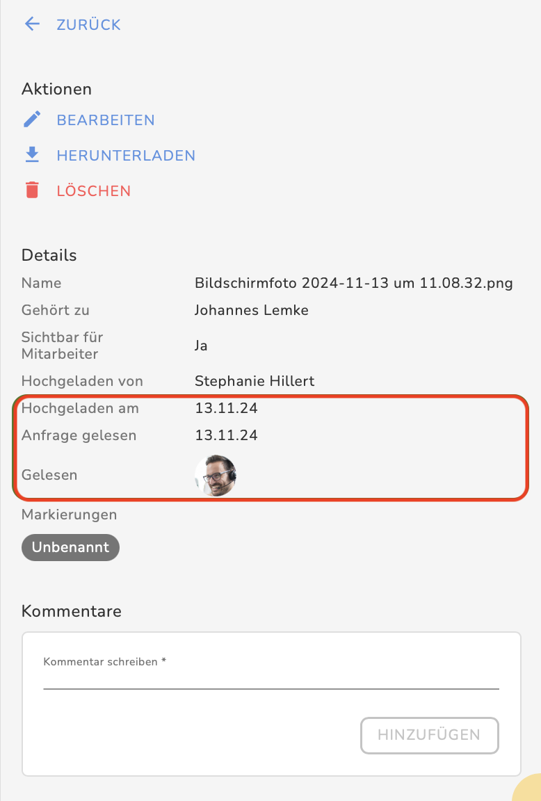 Um den Gelesen-Status des Dokuments zu überprüfen, klicke auf das Dokument im Mitarbeiterordner und sehe den Status in der rechten Menüleiste.