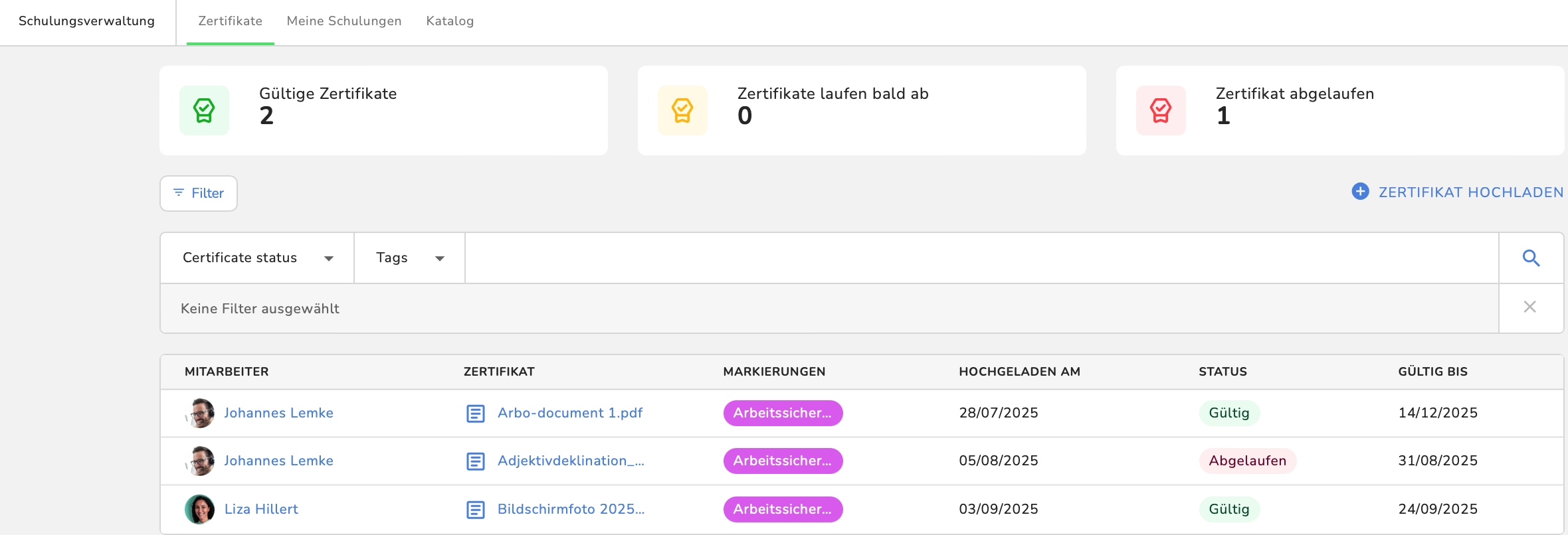 Der Bereich Zertifikate hilft Dir im Modul Schulungsverwaltung den Überblick über gültige, abgelaufene oder bald ablaufende Zertifikate Deiner Mitarbeiter zu behalten. Hier kannst Du ebenfalls alle bestehenden Zertifikate der Mitarbeiter ansehen und herunterladen oder neue Zertifikate hinzufügen.