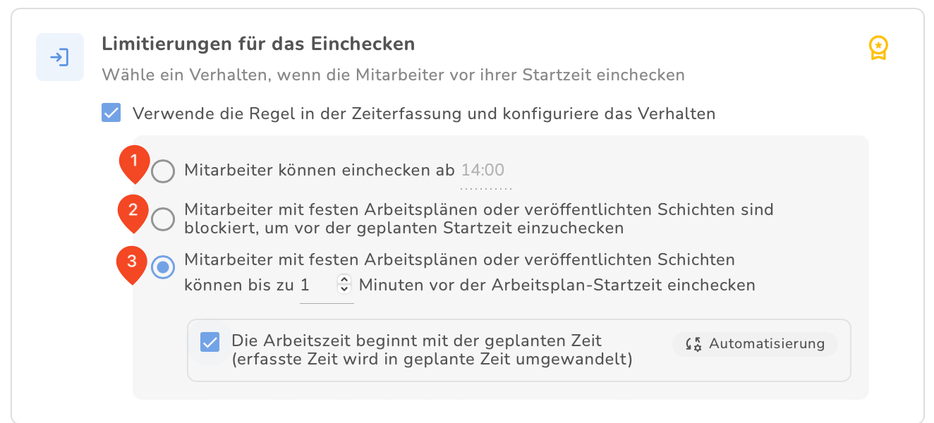 1. Mitarbeiter können ab einer definierten Uhrzeit einchecken.