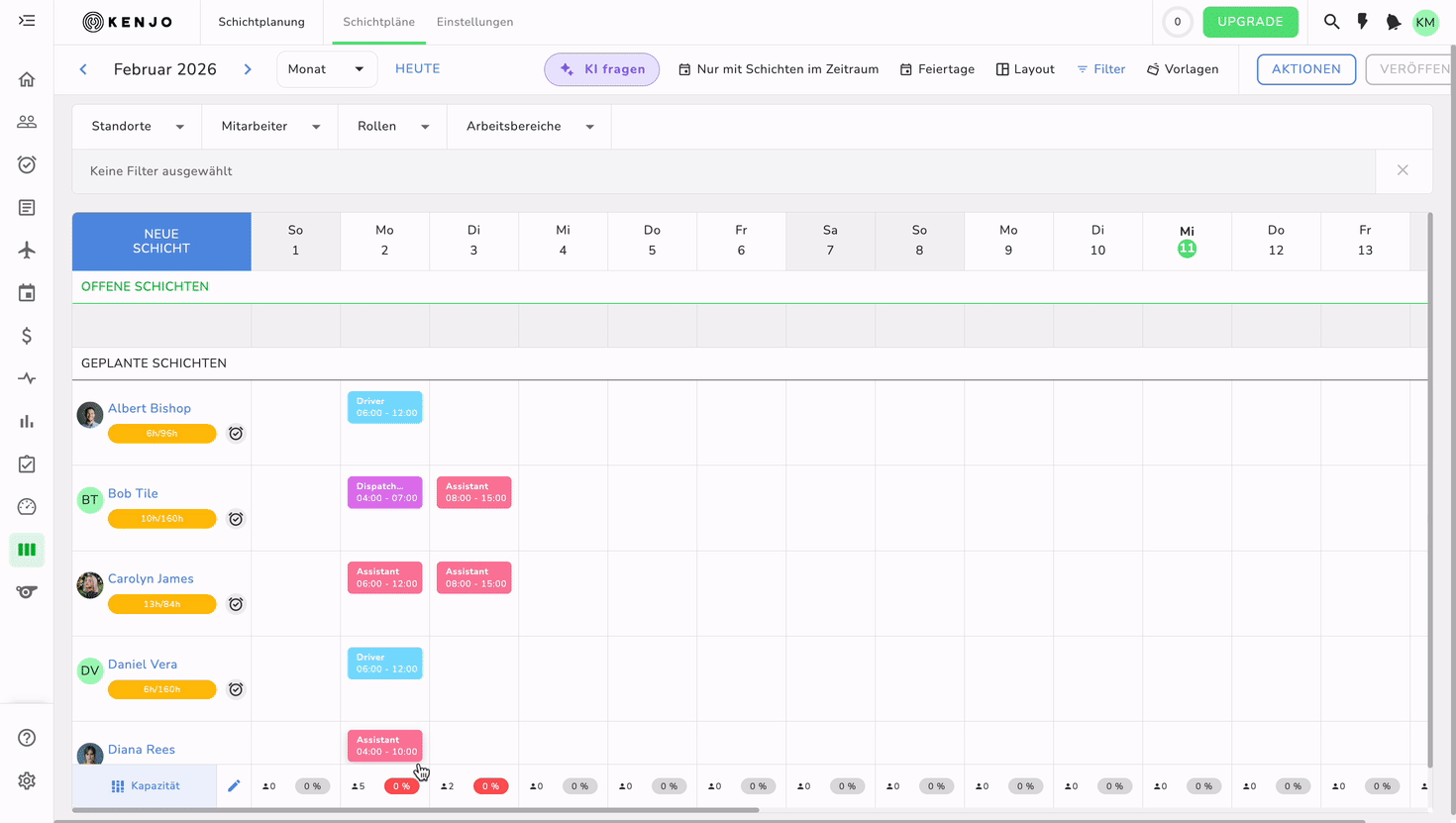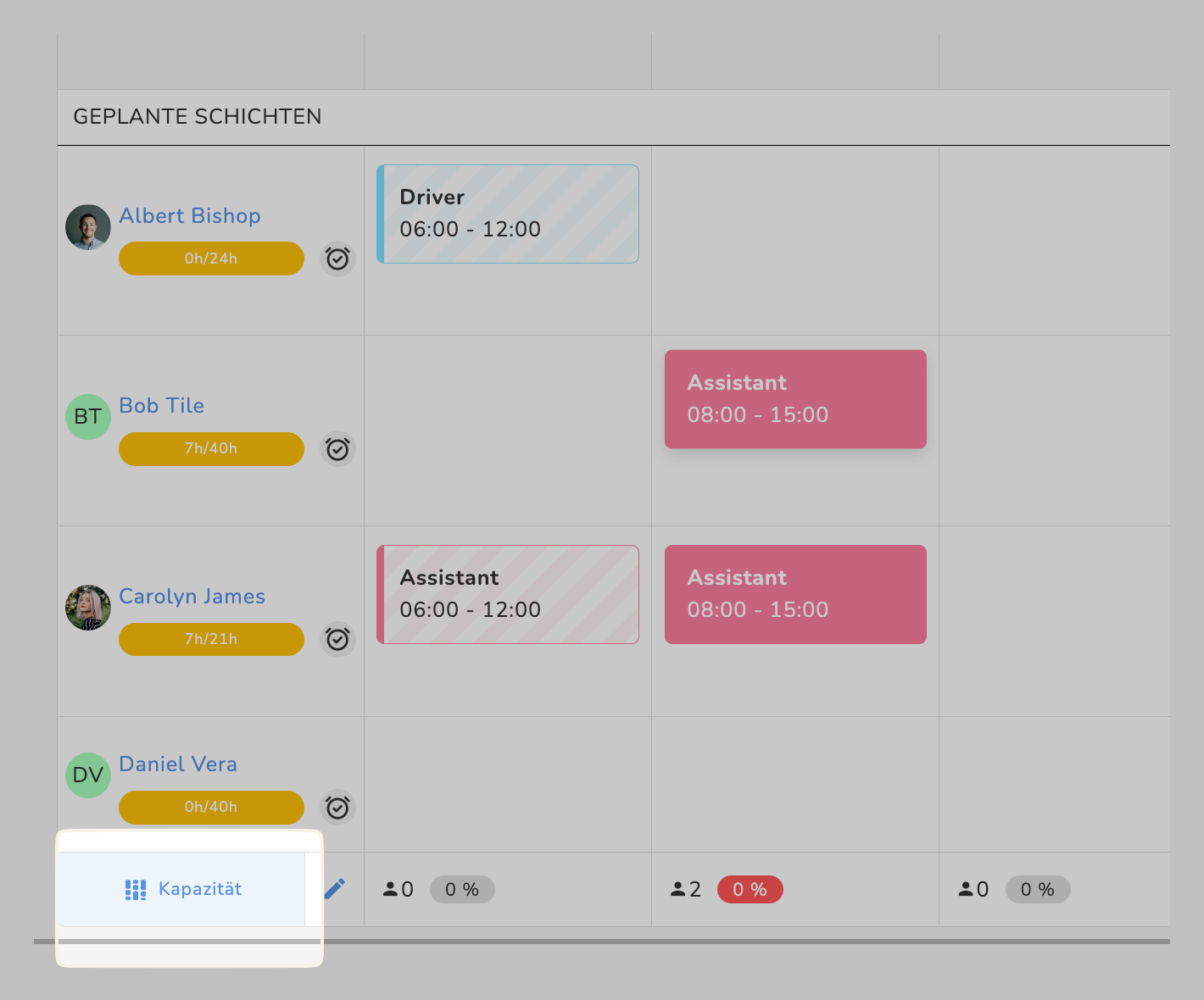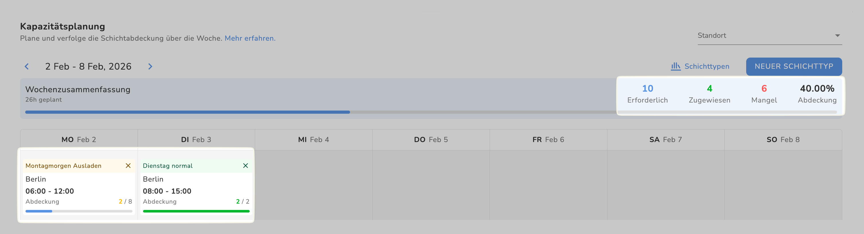 Alles wird in der Kapazitätsfunktion im Schichtplan angezeigt, damit Du schnell Lücken oder Engpässe erkennst und sie beheben kannst — zum Beispiel, indem Du mehr Mitarbeiter zuweist, Schichten anpasst oder Arbeit auf verschiedene Tage verteilst.