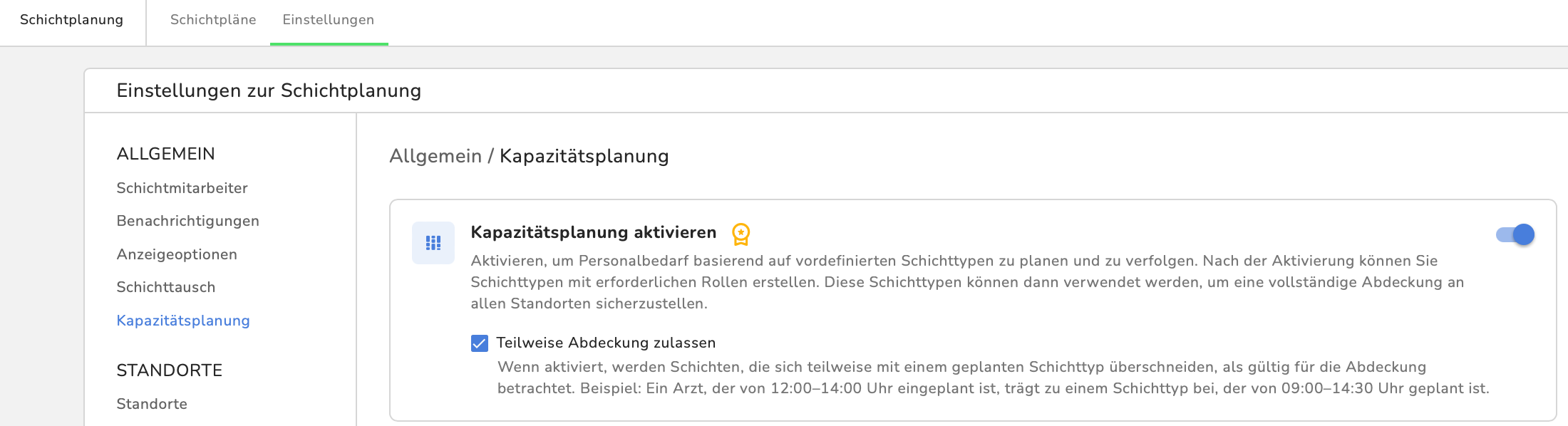 - Gehe zu Schichtplanung > Einstellungen > Kapazitätsplanung