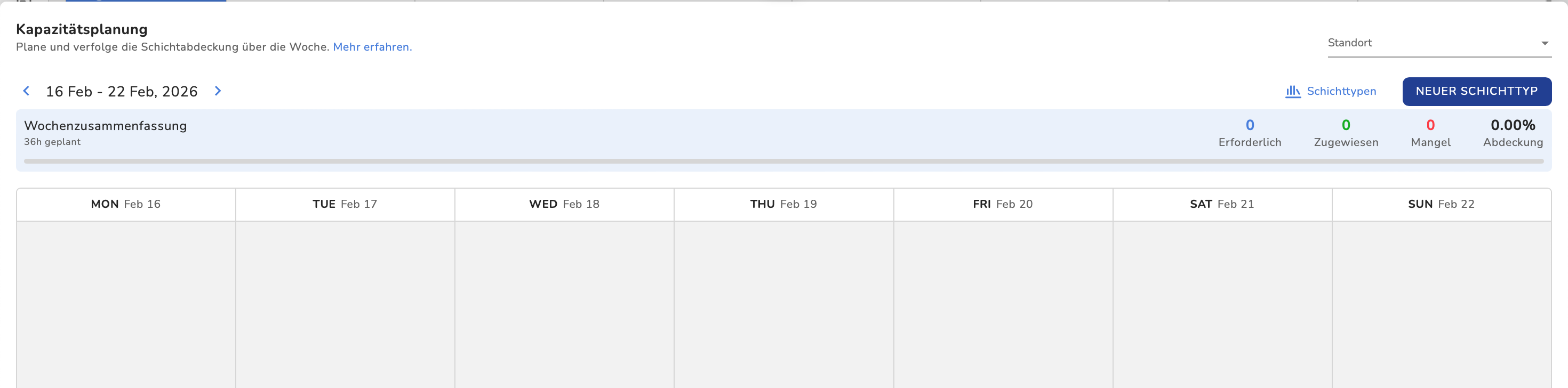 Die angezeigte Standardwoche ist die aktuelle Woche. Nutze die blauen Pfeile, um eine andere Woche zu planen.Ganz rechts kannst Du nach Standorten filtern, um die Kapazitätsabdeckung aller Standorte zu sehen.- Klicke oben rechts auf NEUER SCHICHTTYP oder auf das blaue (+)