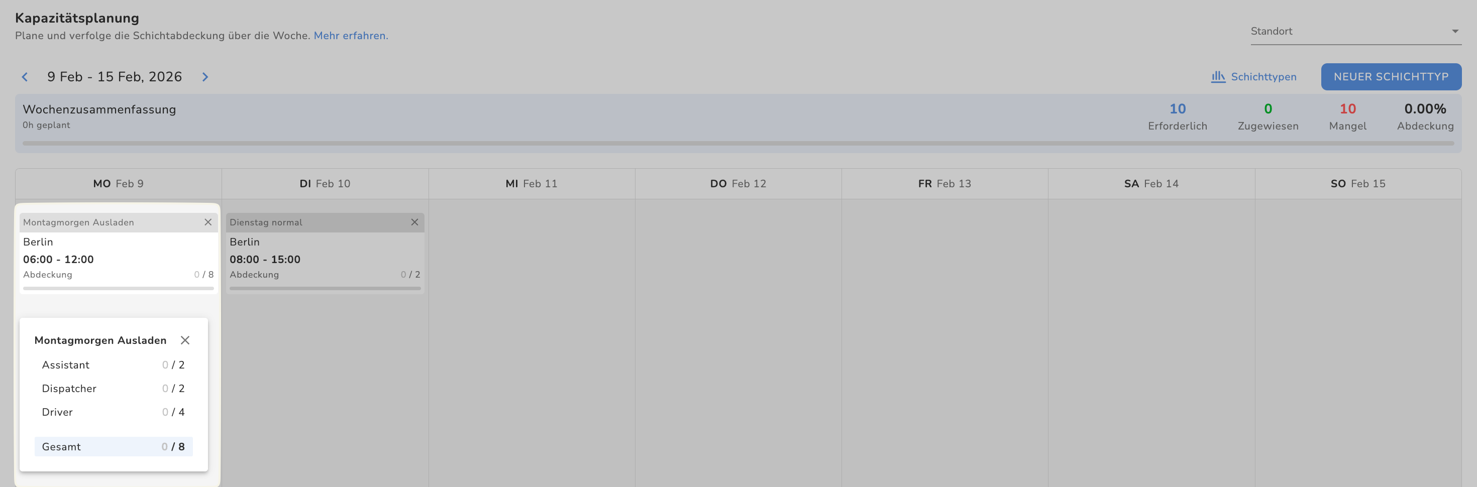 Jetzt siehst Du die geplante Kapazität für den Schichttyp „Montagmorgen Ausladen" und siehst, dass sie bei 0/8 Mitarbeitern liegt, weil noch keine Schichten veröffentlicht wurden.