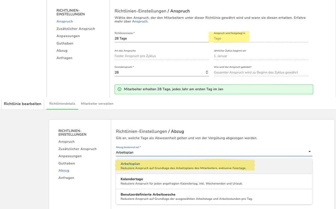 Hinweis: Wir empfehlen bei unregelmäßigen Arbeitsplänen den Abwesenheitsanspruch in den Richtlinieneinstellungen in Tagen und beim Abzug den Arbeitsplan anzugeben.