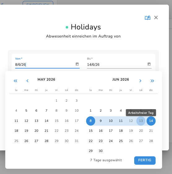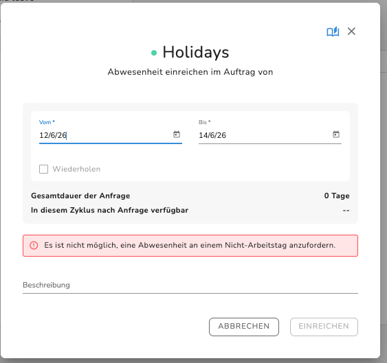 2. Fall: Abwesenheit beantragen, mit veröffentlichtem Schichtplan