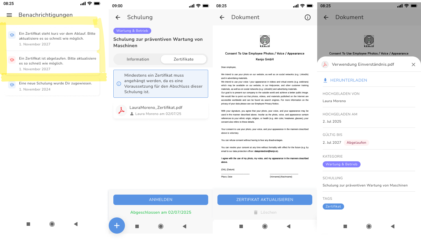 Verwalte Team-Zertifikate und Qualifikationen ohne Excel-Chaos – jetzt auch mit der mobilen Kenjo App! Behalte den Überblick, wer was lernt – und wo ihr steht. Erhalte volle Transparenz über die Weiterbildungsaktivitäten Deines Teams und lasse rechtzeitig dara, wenn Zertifikate ablaufen – mit Benachrichtigungen zu auslaufenden Zertifikaten und mehr.