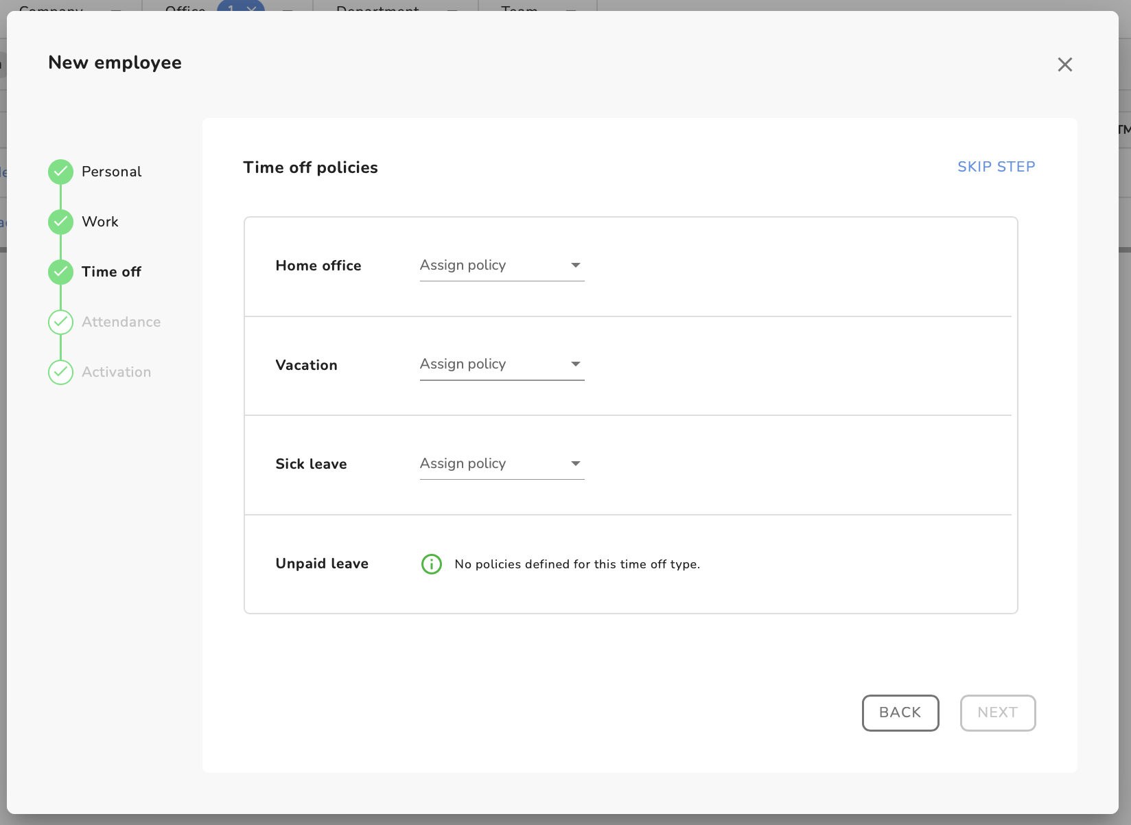 The next step will be to assign the time off policies to your employee. This part of the process is optional and you can click on SKIP STEP or NEXT if you wish to wait and assign them later. Take into consideration that the time-off types that will appear here are the ones you have configured before in Settings > Time off > Settings.