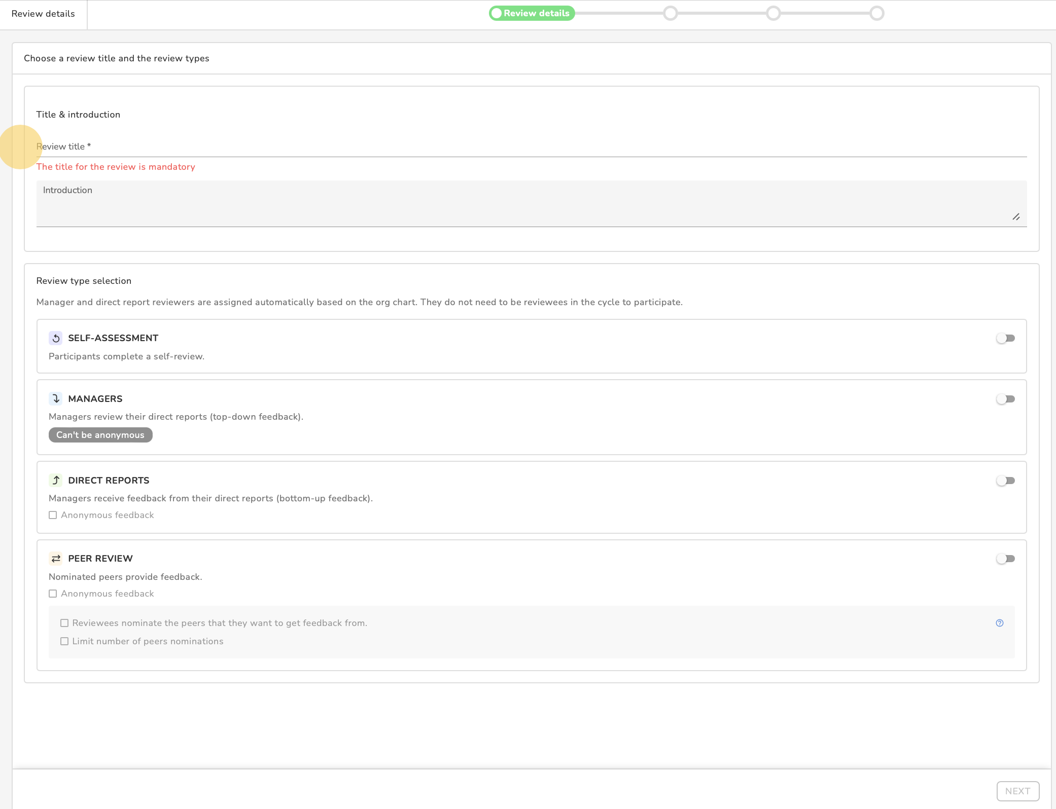 For performance reviews involving managers and direct reports, Kenjo automatically assigns feedback providers based on your company structure. Feedback providers don’t need to be feedback reviewees to participate.Once you complete the steps, click SAVE & NEXT to continue setting up the review.