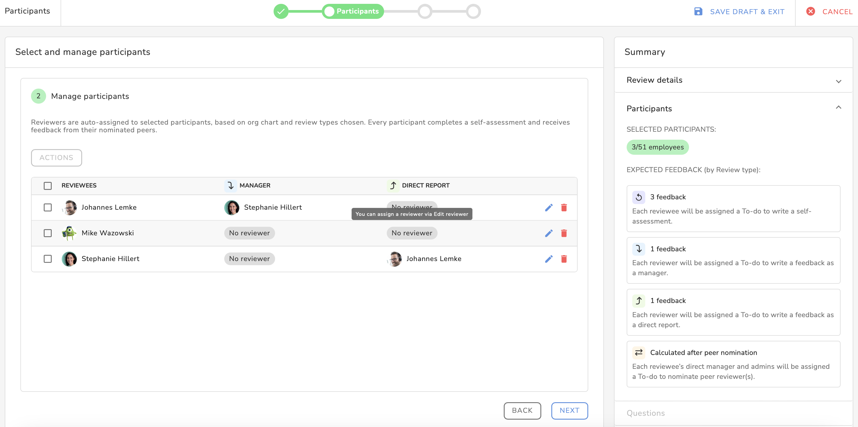 On the right, under Summary, you’ll see a wrap up of your entered details, including the amount of feedbacks clustered by review types, e.g. 2 self-assessments or 2 manager feedbacks that will have to be given.
