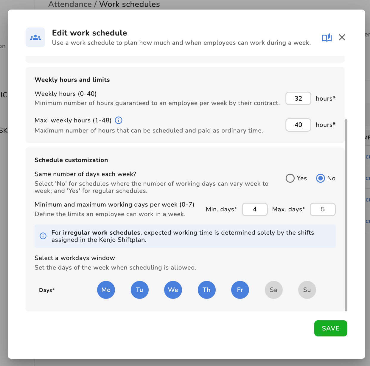 - You can edit the weekly hours (minimum and maximum hours, if necessary) and the schedule customization and work days