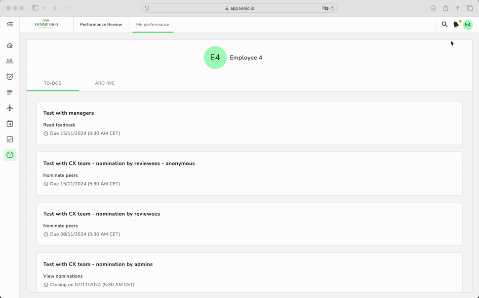 Every employee can access their own ongoing reviews via the My Performance > To-Dos and their completed reviews via My Performance > Archive.