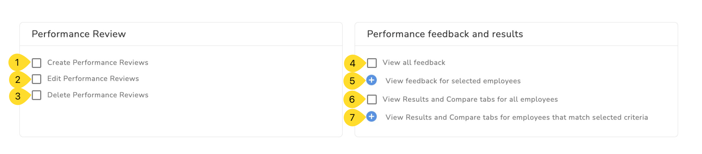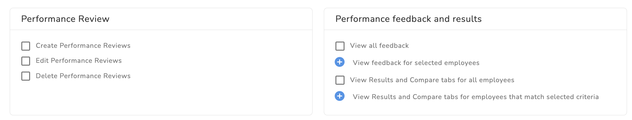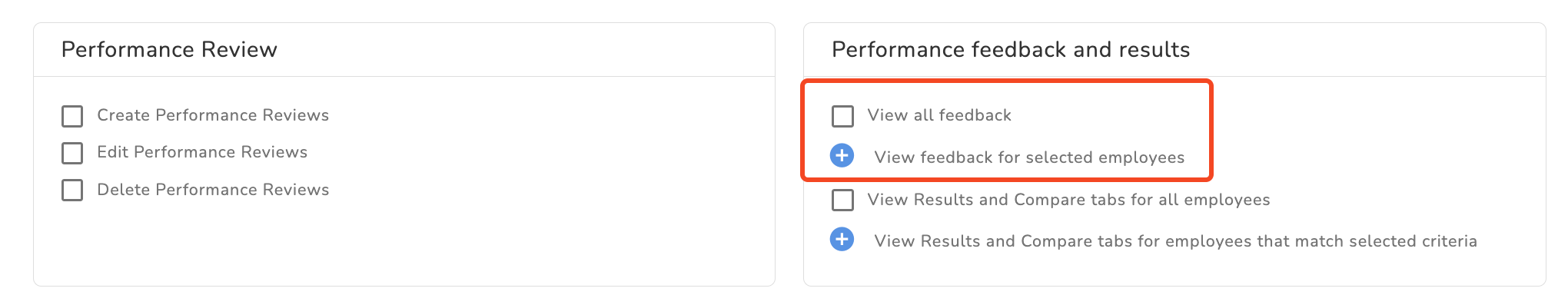 To customize your Performance review permissions you will find two tabs Performance Review and Performance feedback and results.