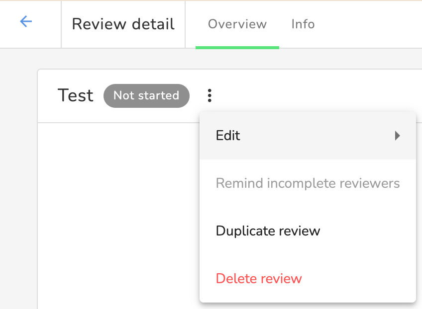 | Performance review | 1 Create performance reviews | Employees can create new performance reviews![]() | Access to the Reviews page is - required to create, edit or delete performance reviews - dependent on the view feedback permission ![]() |