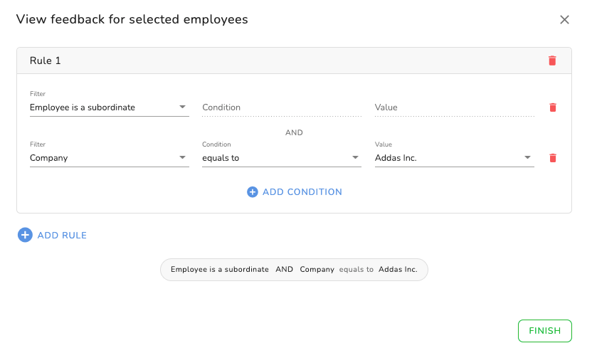 You can choose the rules that will restrict the permissions the customized profiles will have. In the example below, we have added the Filter Employee is a subordinate and Company - equals to - Addas. This means that the employees who have this profile assigned to them can only view feedback from subordinates that belong to Addas company.