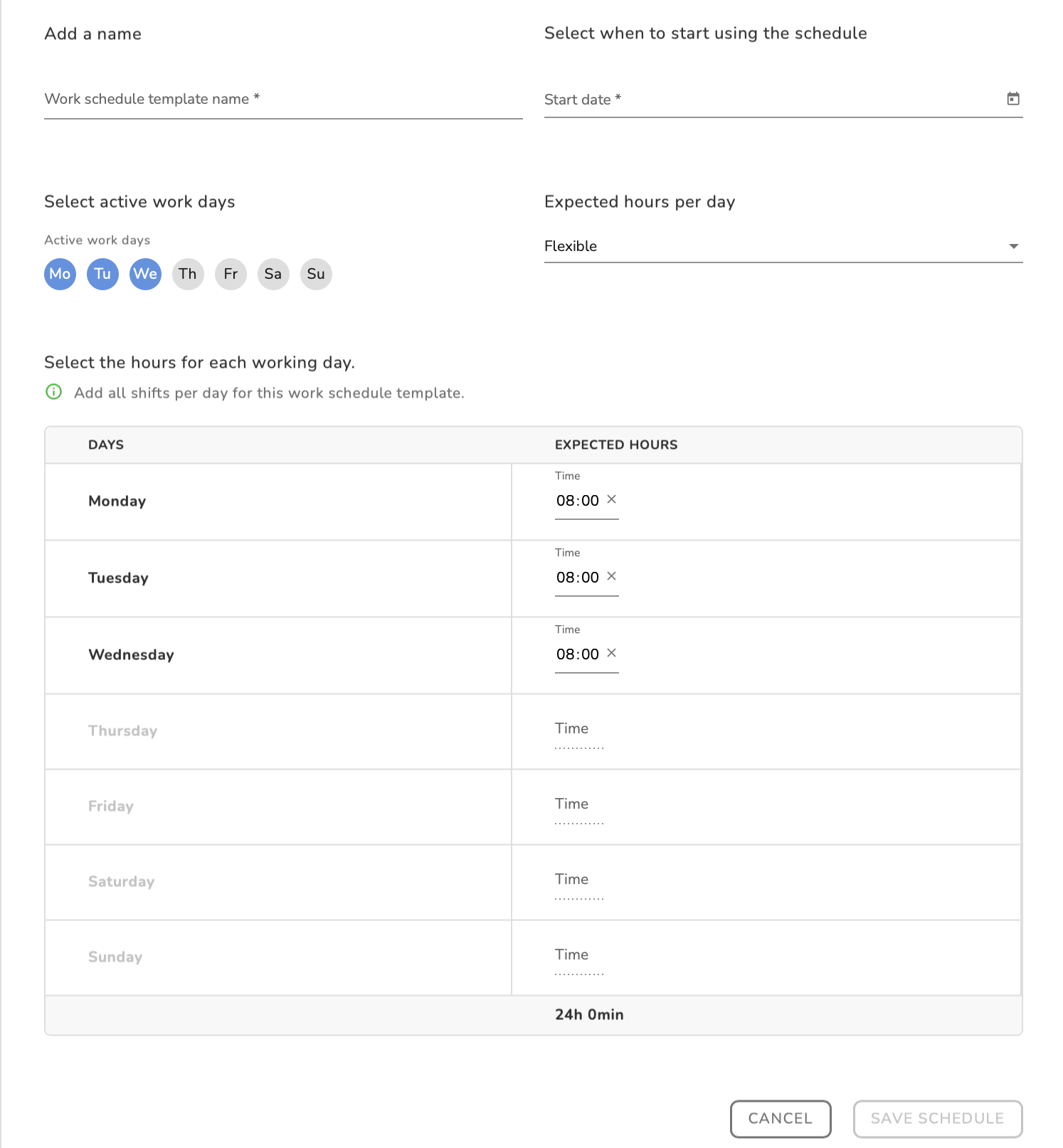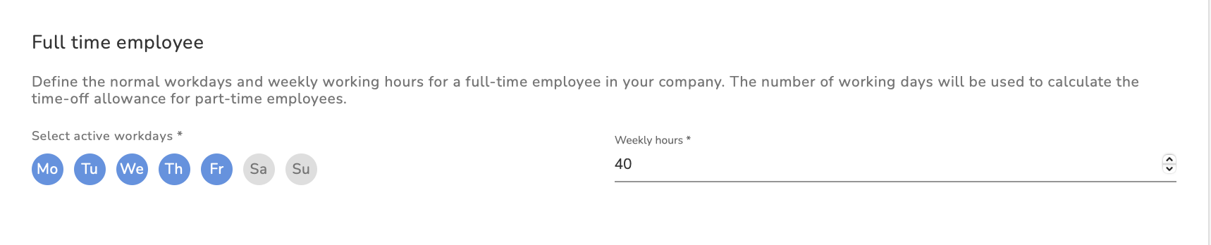 - Define working hours by setting, for each workday, the number of hours the employee works that day.