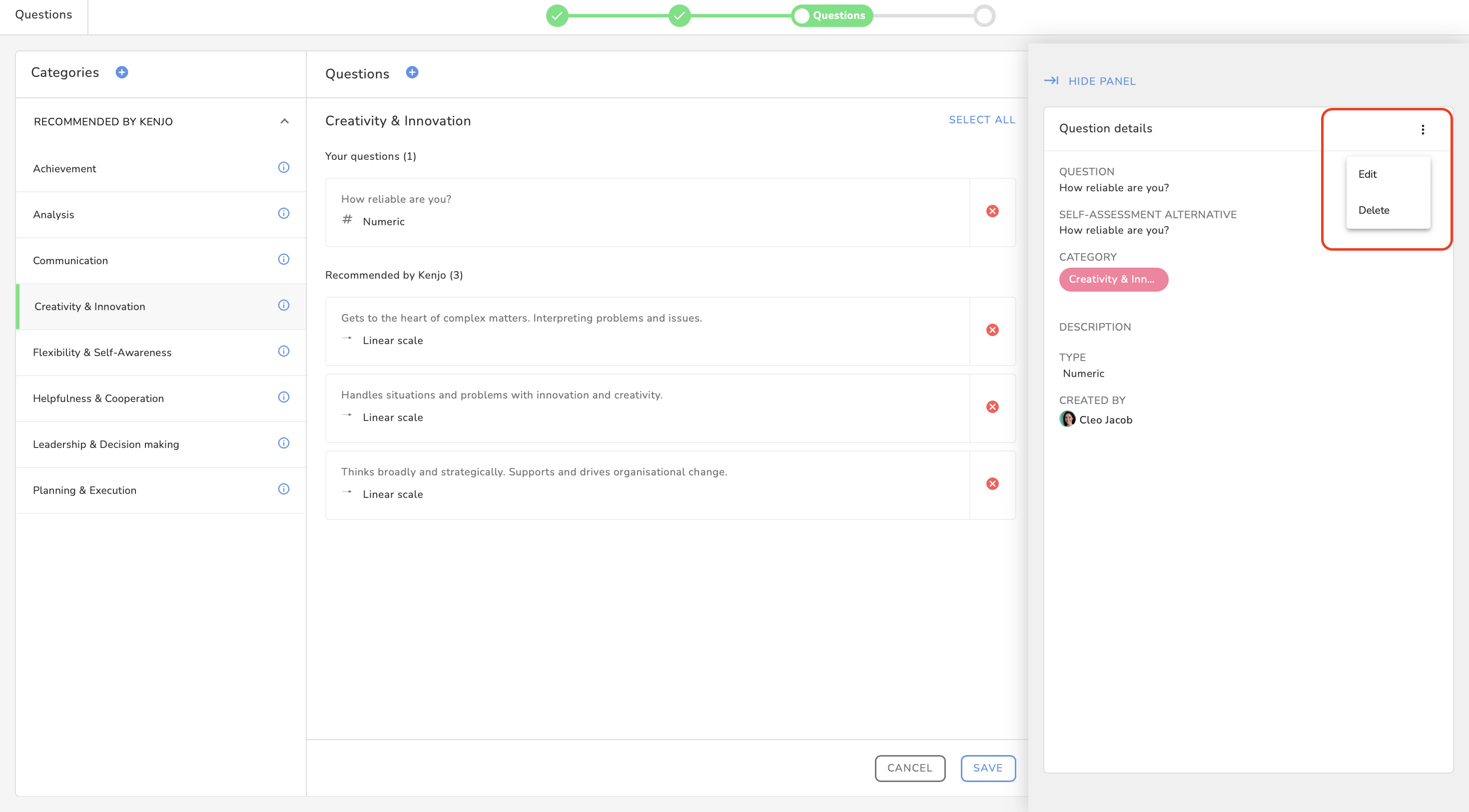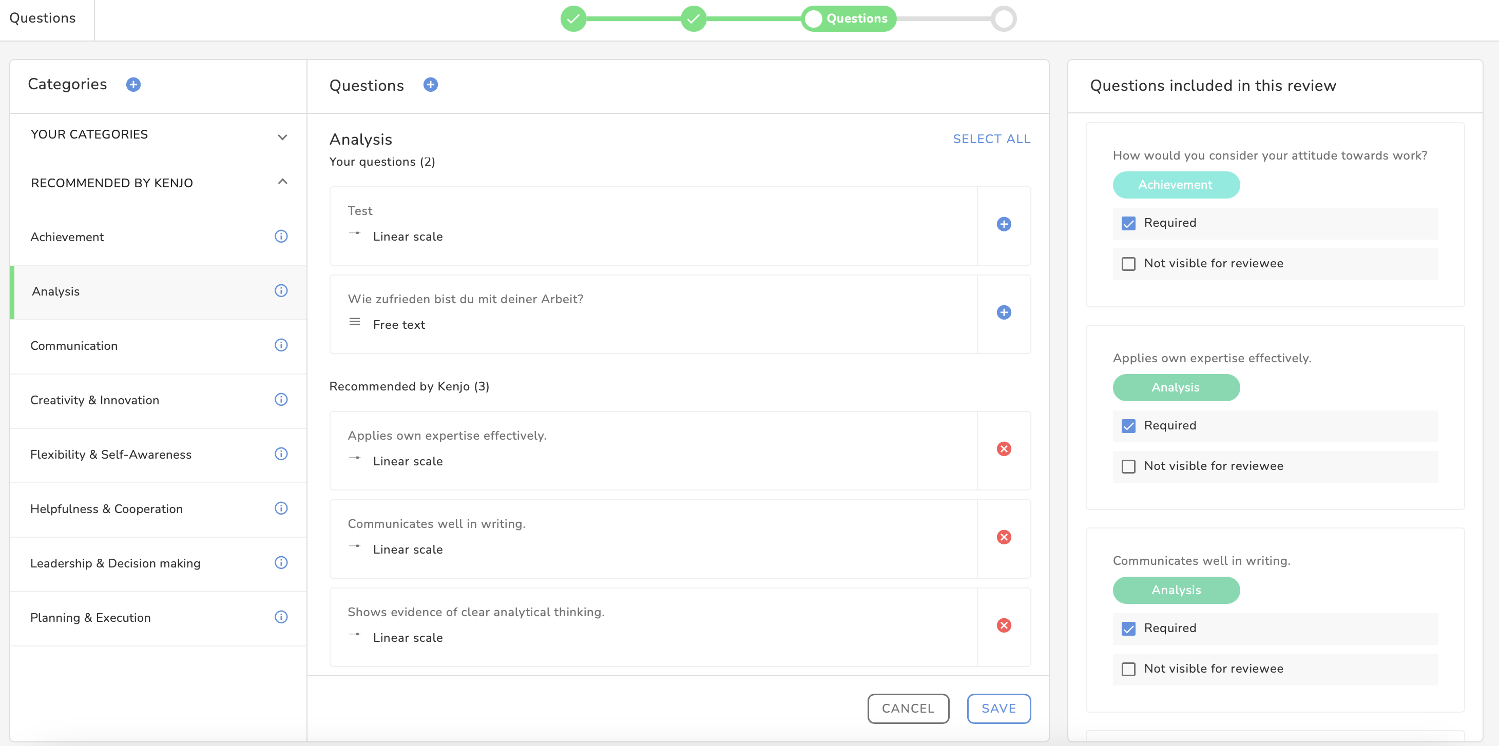 The Recommended by Kenjo categories cannot be edited or deleted.It's important to create categories for all aspects you want to assess later, as it will make analyzing results easier.