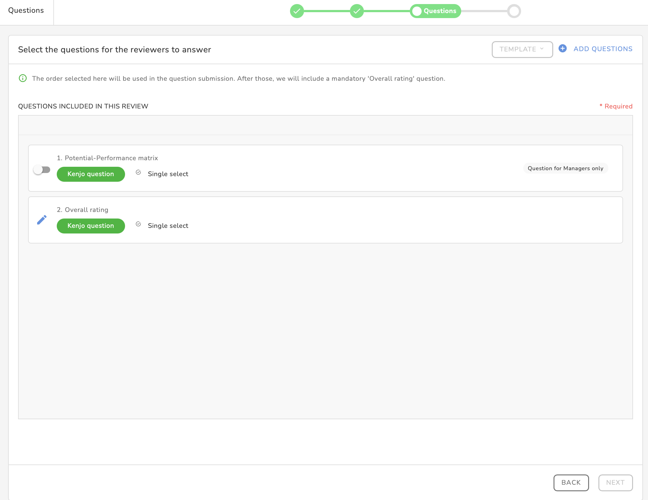 In the Questions section, you can now select the main element – your questions – for the review.