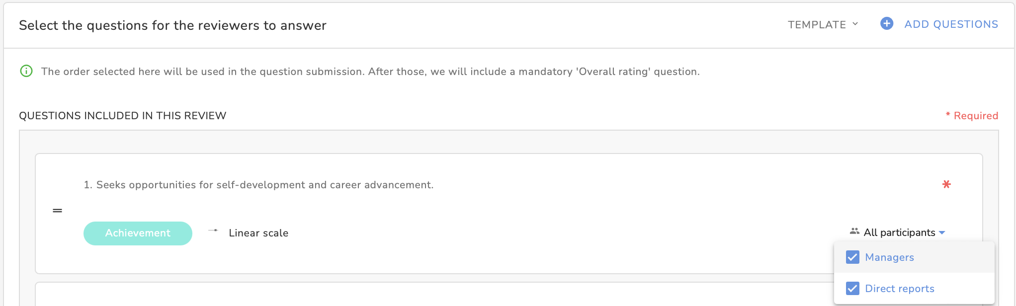 - You can choose if a question is mandatory by selecting Required. If you check Not Visible for reviewee the question won’t be shown to the feedback receiver, but it will still be visible to managers, peers, or direct reports.