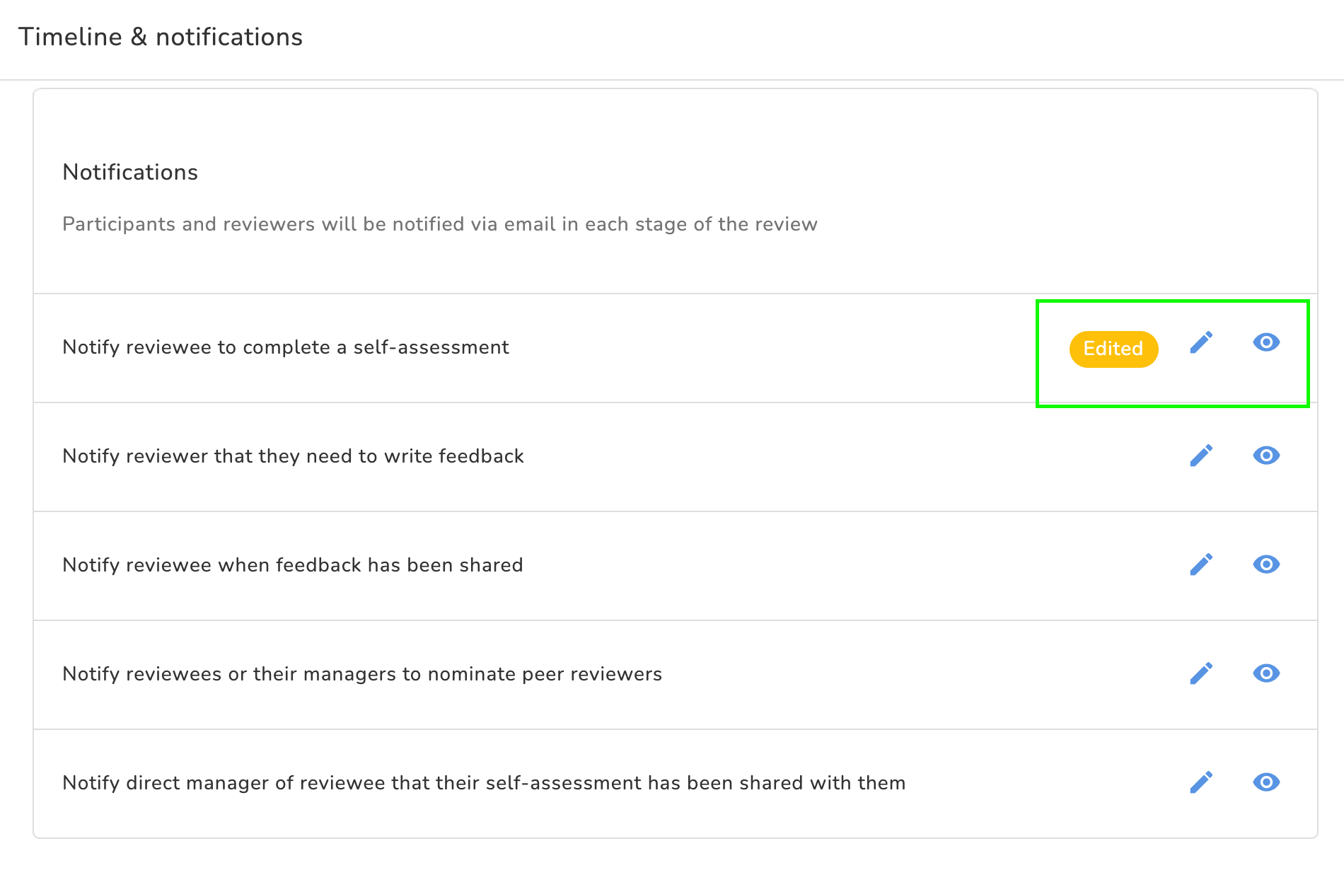 Participants and reviewers will be notified via email at each stage of the review. In this section, you can click on the Preview button to view the respective email templates. If you click on the pencil icon, you can edit or customize the notifications.