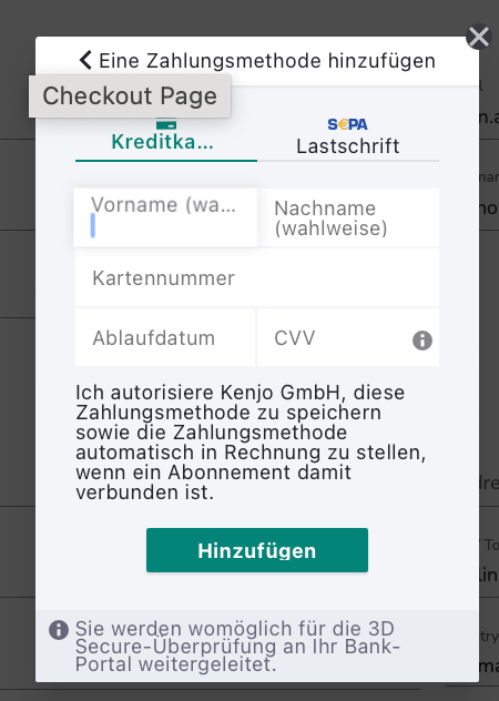 - Click (+) ADD PAYMENT METHOD to store a new credit card or SEPA direct debit