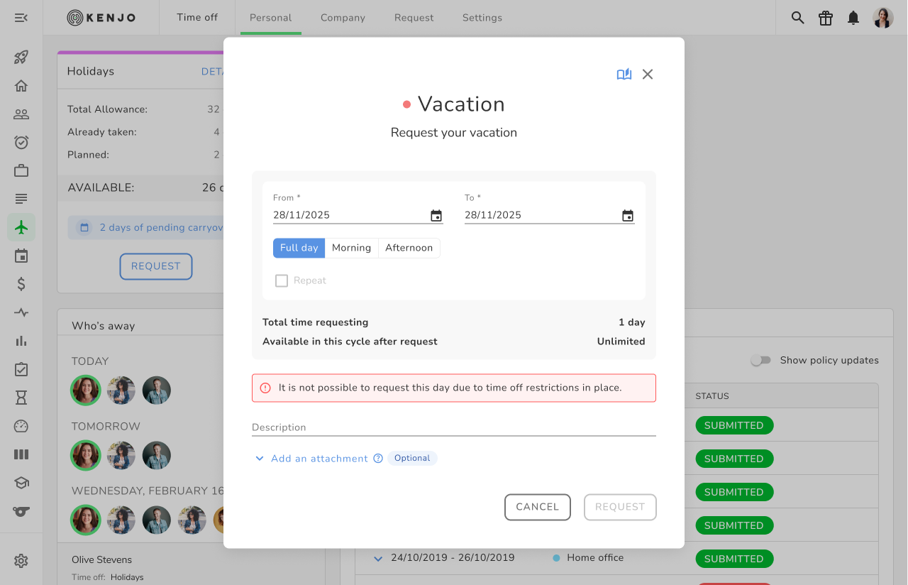 When employees try to request a time off when a restriction is active, they receive a red info note that the request is not possible due to a restriction. Clicking on the request button is not possible.