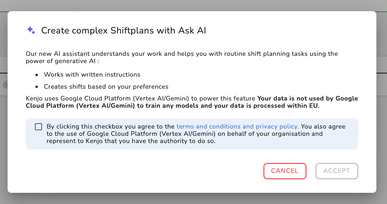 - A pop-up will appear the first time you use it, informing you about the terms and conditions of the Ask AI feature.