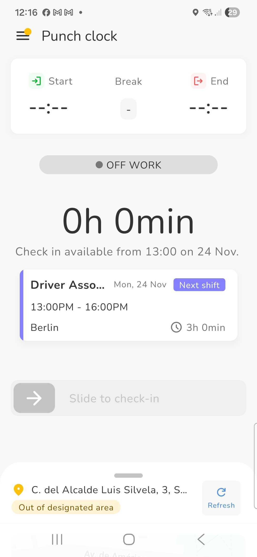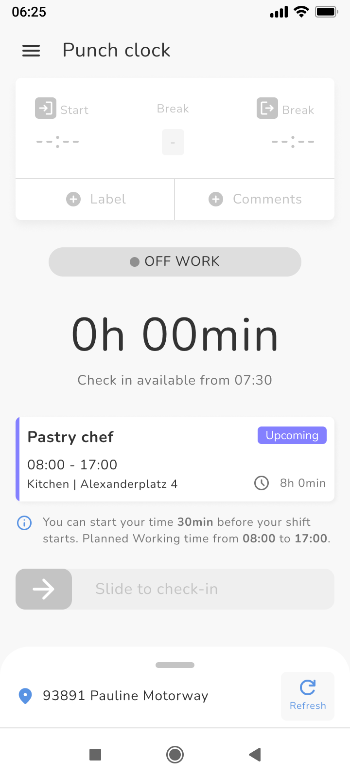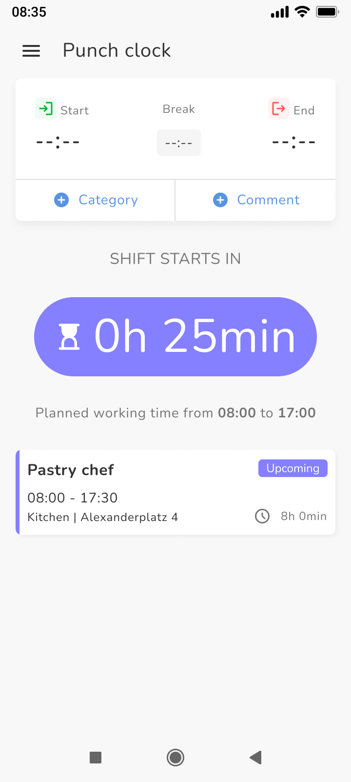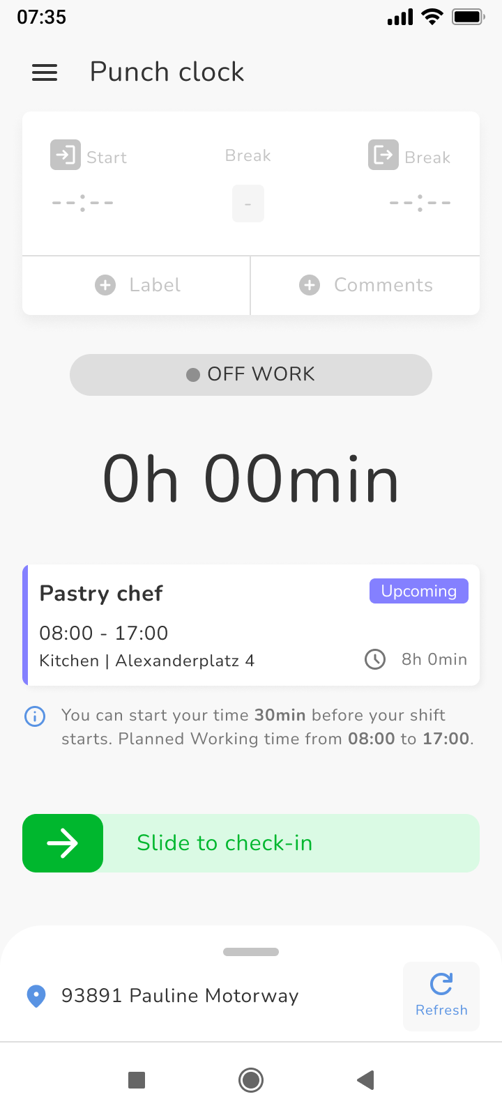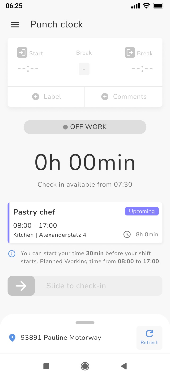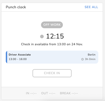 - Employees can clock in early (e.g. 10 minutes before), but paid working time only starts at the originally planned time.