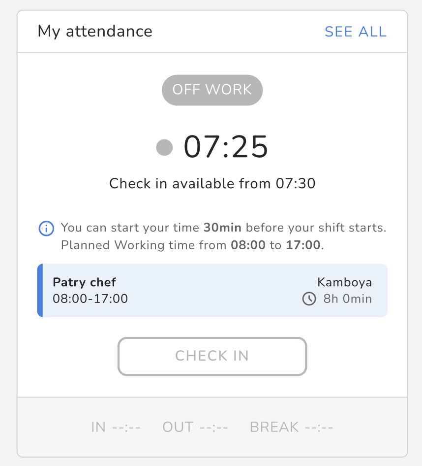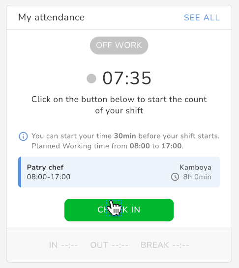 They cannot clock in earlier. In this example, employees can only clock in starting at 07:30 and 8:00 AM. Depending on the method, they will see these messages: