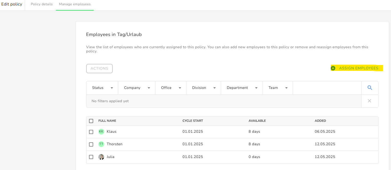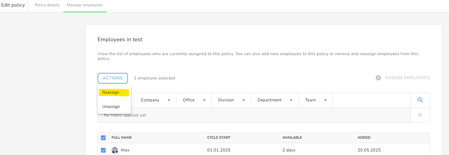 - Therefore, if an employee is already assigned to a policy under a specific time-off type and, as an admin, you want to assign them to a new policy within that same time-off type, you can use the “Reassign employees” option. This allows you to move the employee to the new policy effective from a specific date, while still keeping their historical records under the previous time-off policy.