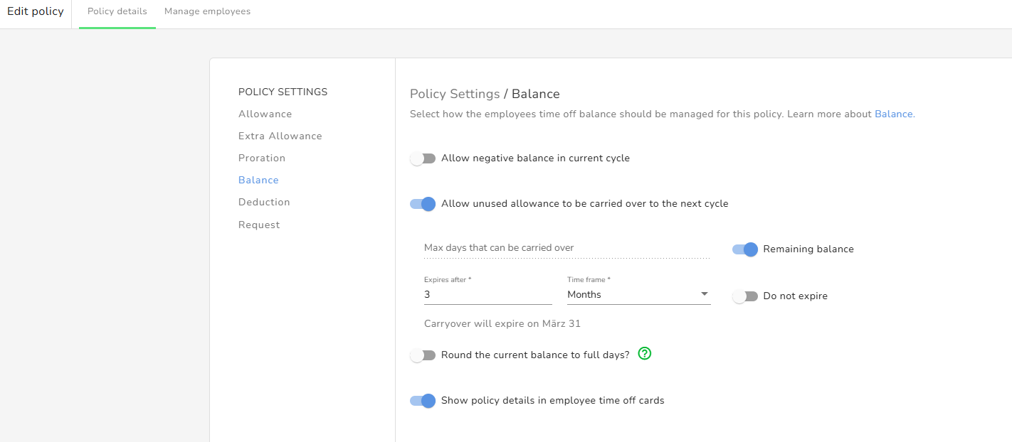 - Under the Balance rules, check if it's allowed or not to carry over pending days to the next cycle