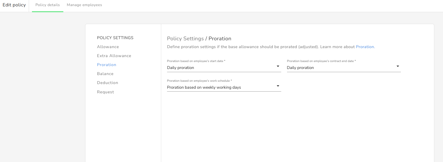 - Review your policy settings for your major time-off policies, especially regarding Proration rules
