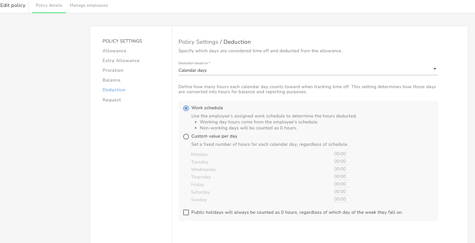- In the Deduction section, specify which days are considered time off and are deducted from the allowance: calendar days, working days, or use a custom workweek