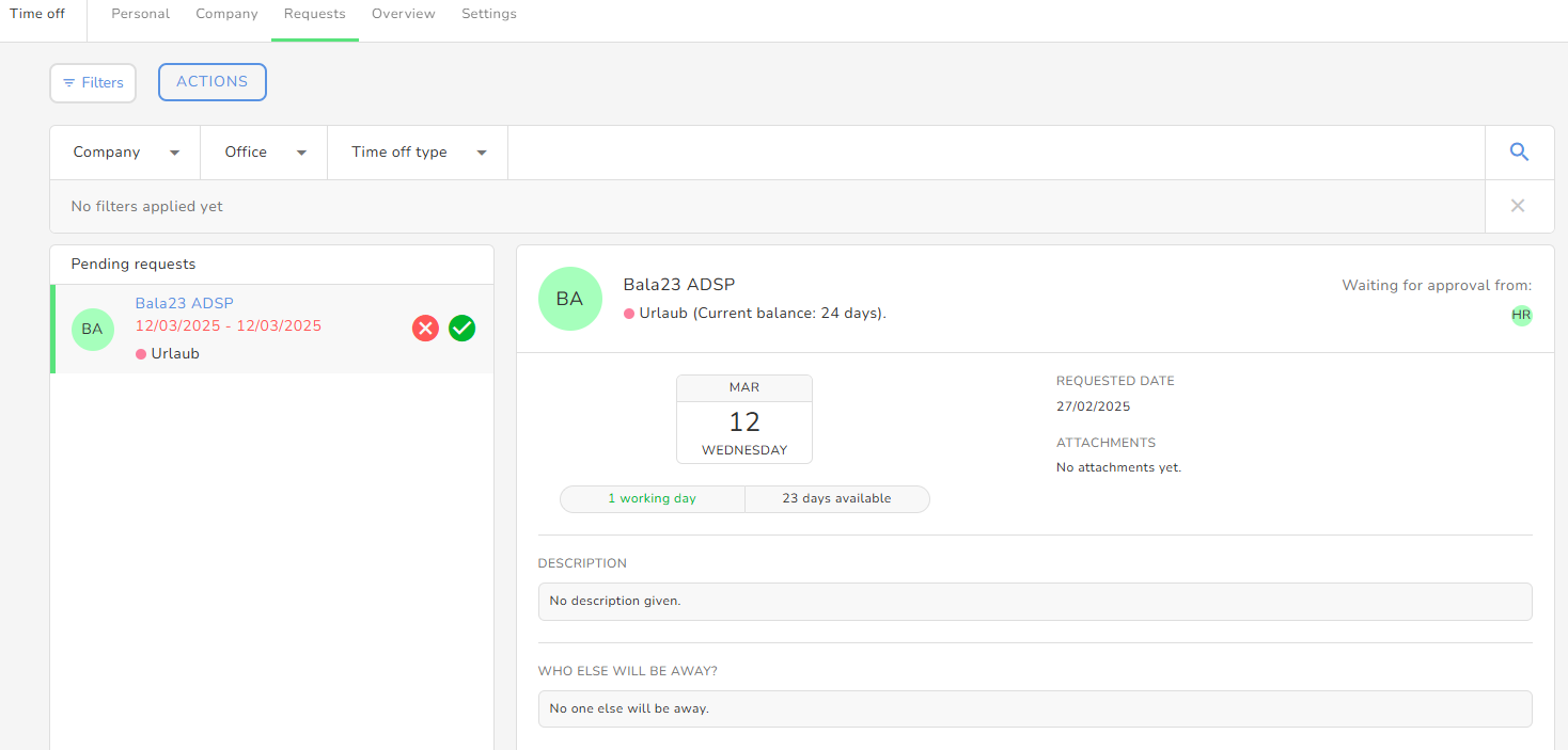 - As an Admin/HR Admin, you can accept or reject the Time off Requests by clicking on the green Check or red x
