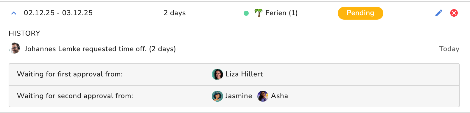 If a time off request requires approval in two steps, you will see on the top right corner the indication “Waiting for approval from”.
