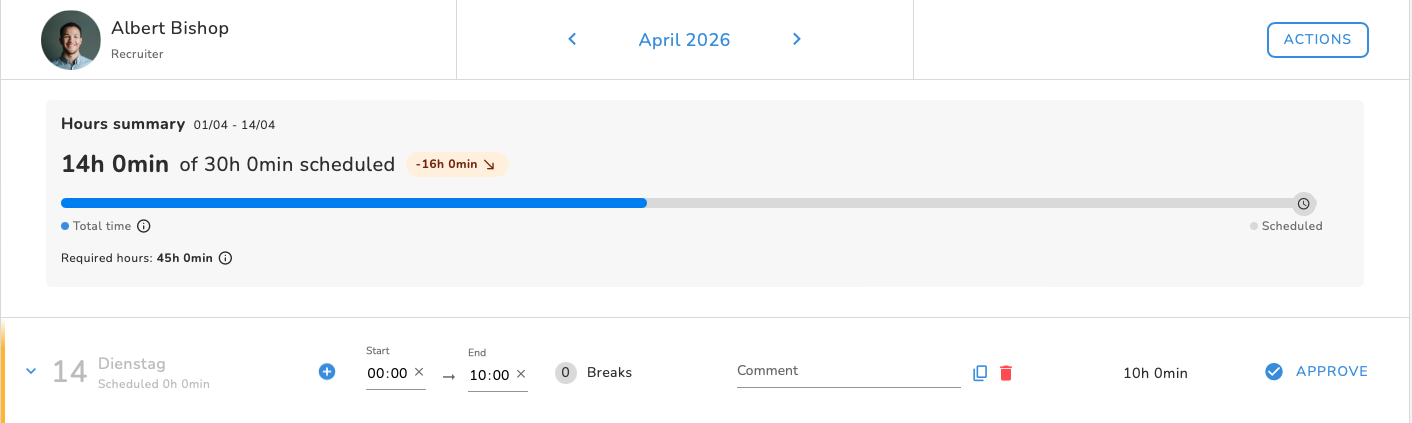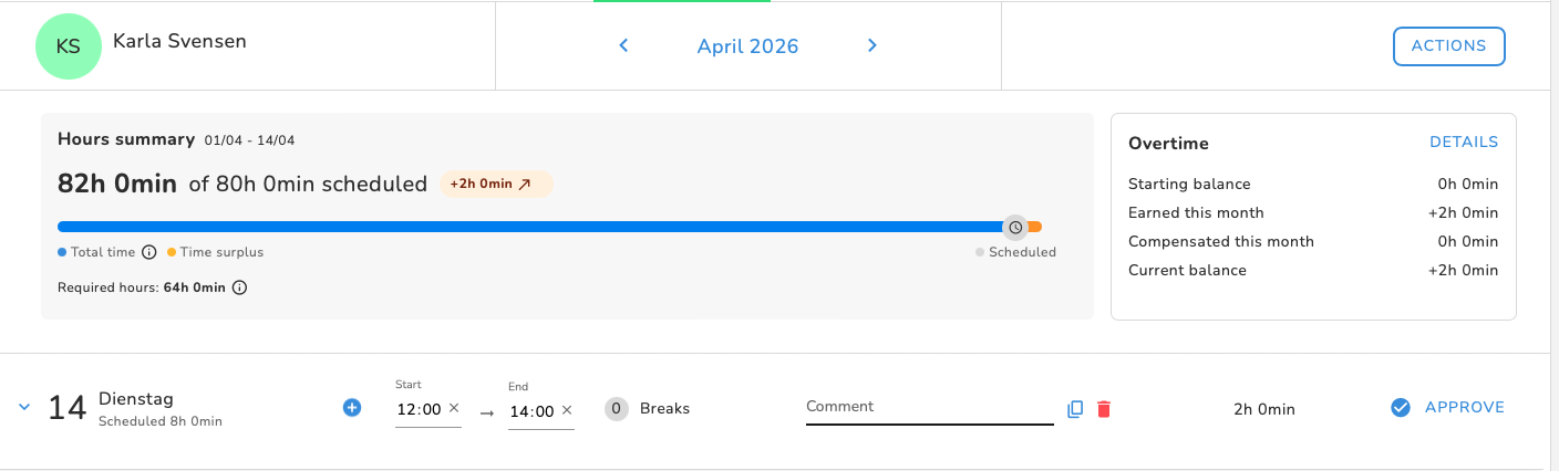- and the difference between tracked and scheduled hours, indicating whether more or fewer hours were worked than planned (time surplus or time deficit)