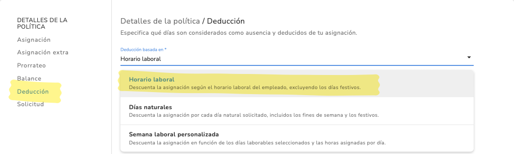 Note: For irregular work schedules, we recommend setting the Time off entitlement in the policy settings to days and selecting the Work schedule for the deduction.
