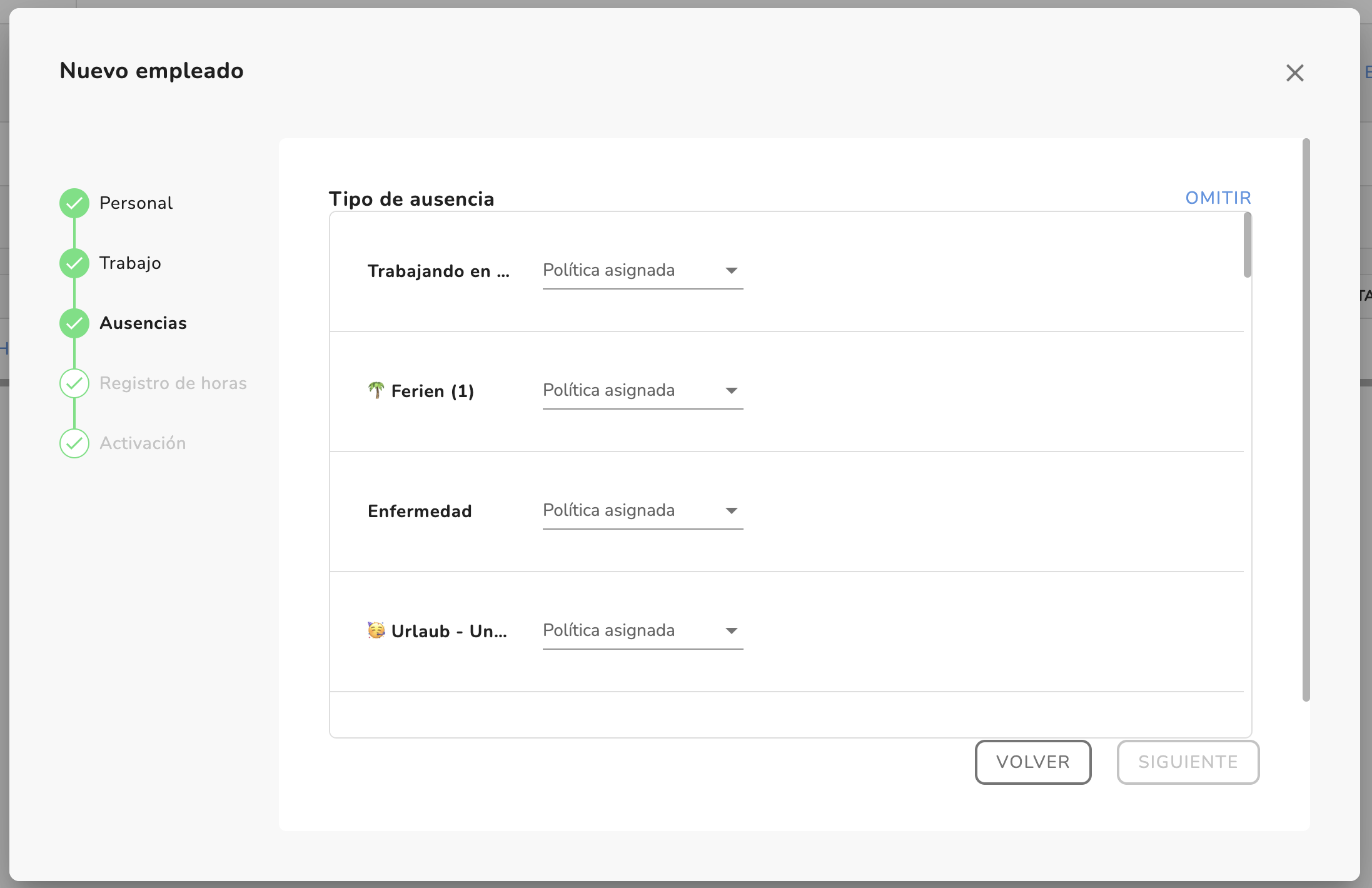 El siguiente paso será asignar las políticas de tiempo libre a tu empleado. Esta parte del proceso es opcional y puedes hacer clic en SALTAR PASO o SIGUIENTE si prefieres esperar y asignarlas más tarde. Ten en cuenta que los tipos de tiempo libre que aparecerán aquí son los que hayas configurado previamente en Configuración > Tiempo Libre > Configuración