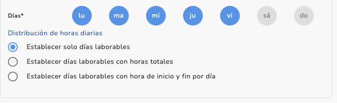 | Selecciona los días exactos de trabajo por semana. | Selecciona una ventana de días laborables, es decir, todos los días en los que los empleados podrían trabajar. |