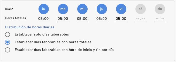 | 1. Establecer solo los días laborables: Las horas se calculan automáticamente y se distribuyen de forma uniforme. (Ejemplo: 40 horas / 5 días = 8 horas por día) ![]() | |