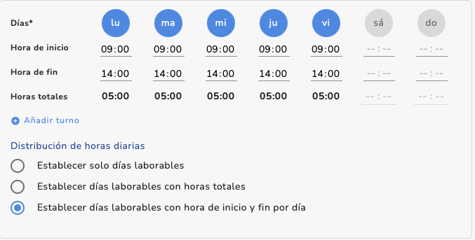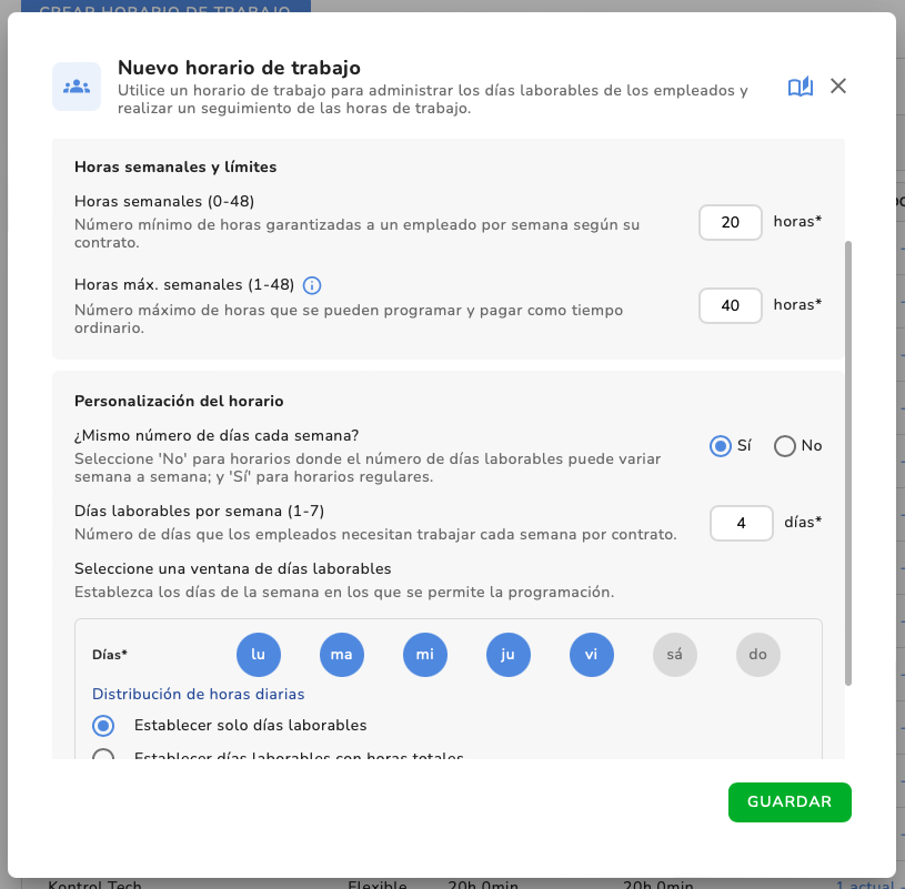 2. Establecer días con horas totales (horario flexible): El empleador define manualmente las horas diarias totales. Los empleados pueden elegir su hora de inicio y fin, siempre que se cumpla el objetivo diario.![]() | |