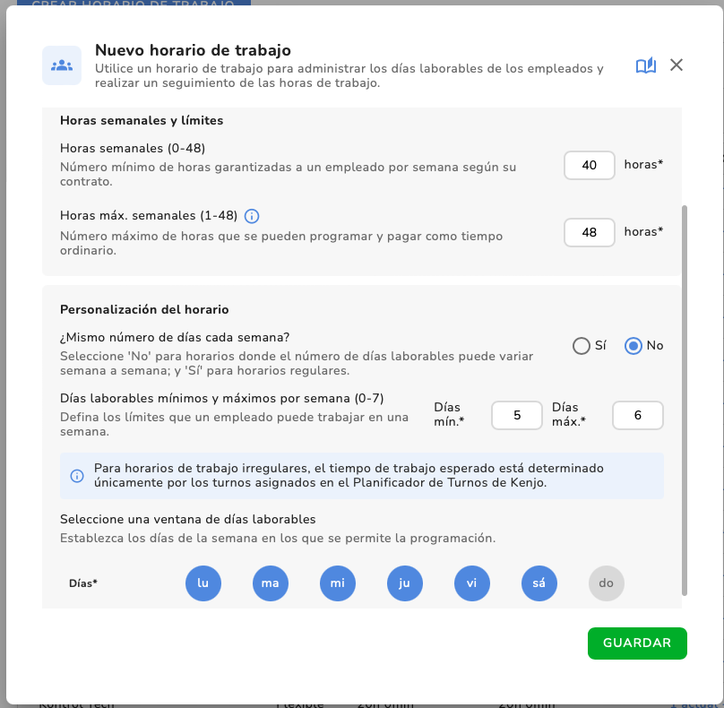 | 7. Configuración de los días laborables: define cómo se distribuyen las horas semanales entre los días seleccionados. Existen tres métodos principales: | Para este horario de trabajo irregular, el tiempo de trabajo esperado se determina exclusivamente por los turnos asignados en la planificación de turnos de Kenjo. |