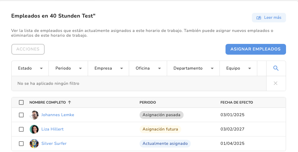 En la siguiente página puedes asignar empleados a tu horario de trabajo. Puedes encontrar empleados fácilmente aplicando filtros o escribiendo sus nombres en el campo de búsqueda.