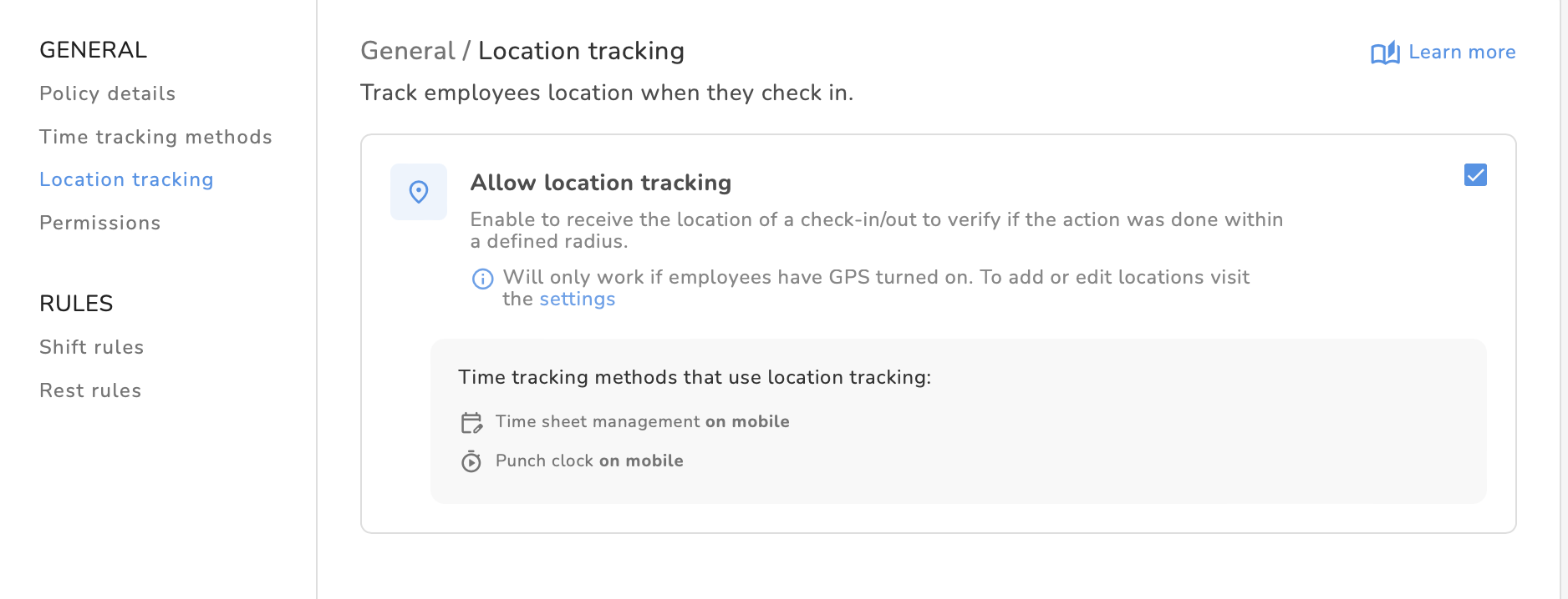 - Ve a Registro de horas > Configuración > Seguimiento de ubicación