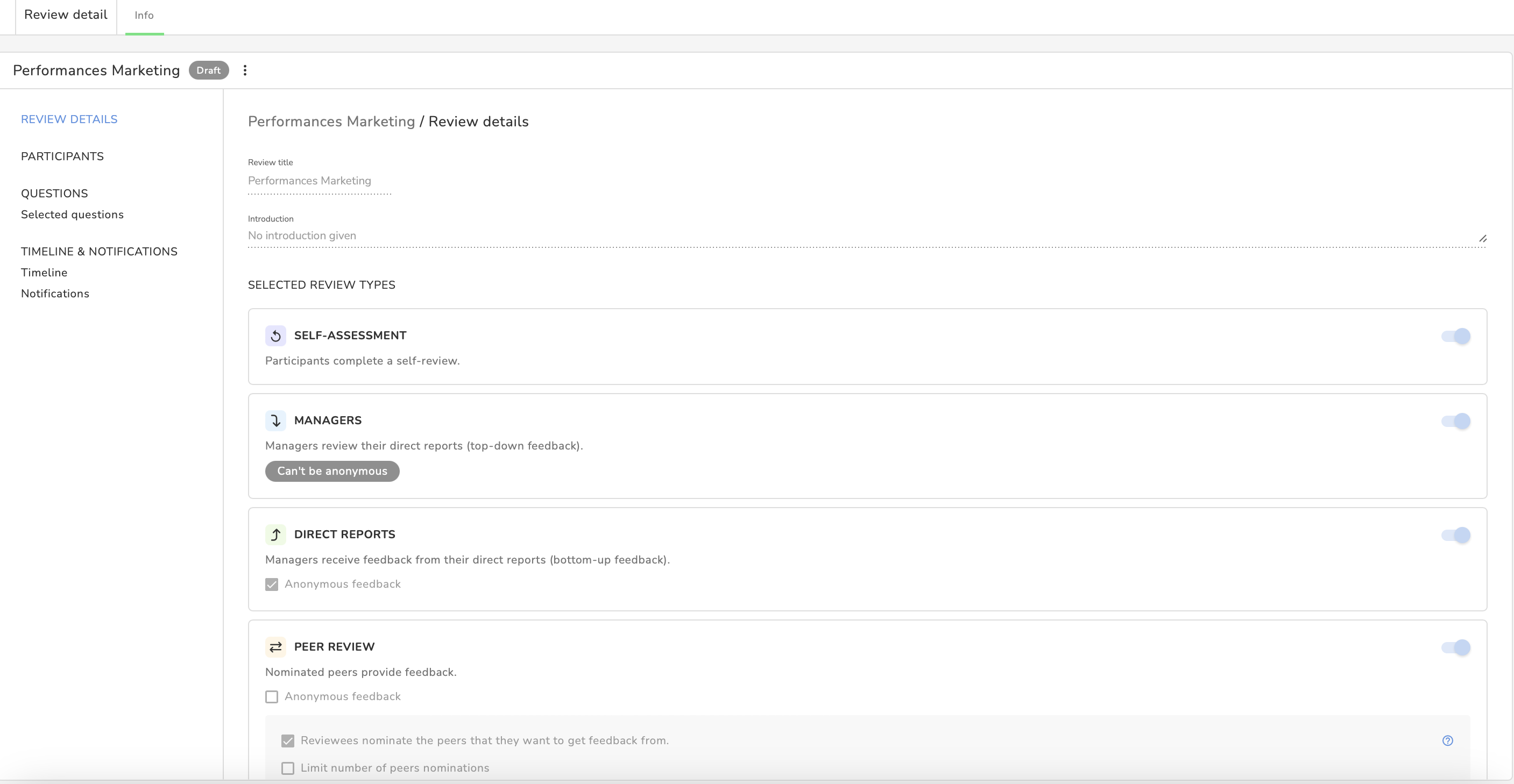 - En Evaluación del desempeño > Evaluaciones, haz clic en el título de la evaluación cuya información quieras consultar