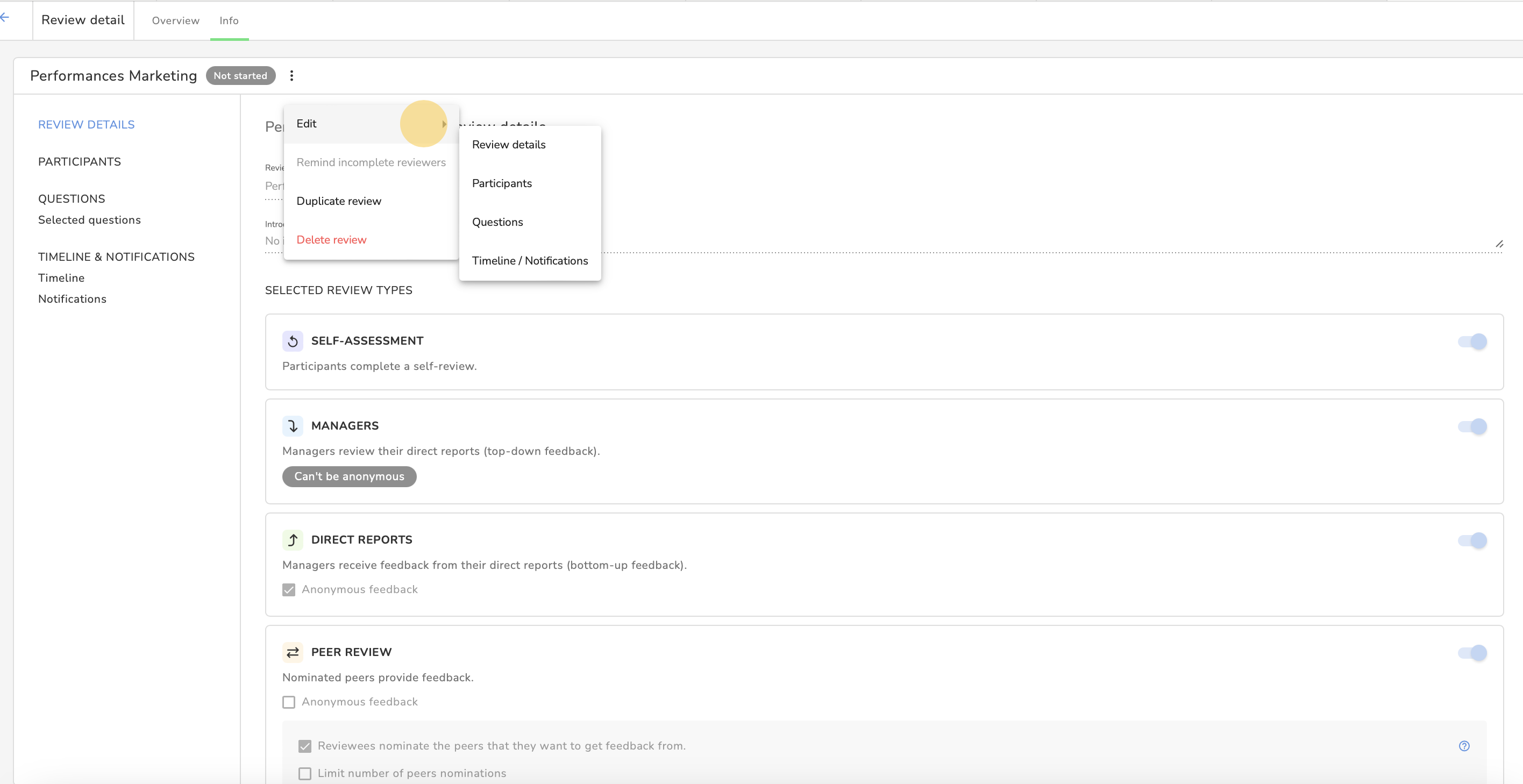 - En Evaluación del desempeño > Evaluaciones, haz clic en el título de la evaluación que deseas editar.